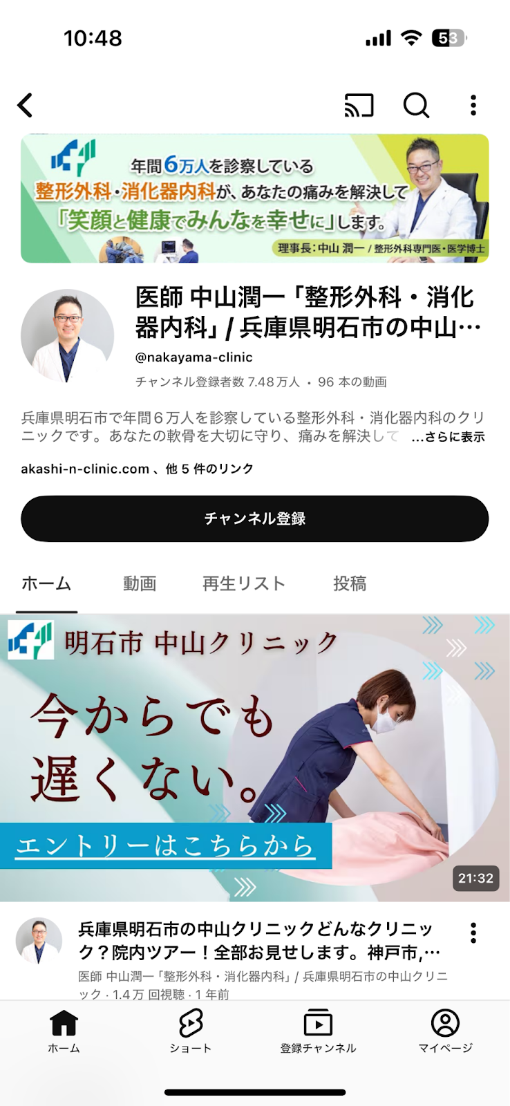 クリニックのYouTubeアカウント成功事例4つ目は、医師 中山潤一「整形外科・消化器内科」 / 兵庫県明石市の中山クリニックです。