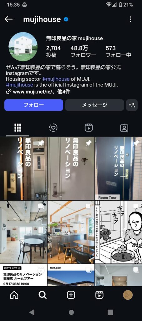 不動産インスタアカウントの成功事例の2つ目は、無印良品の家です。