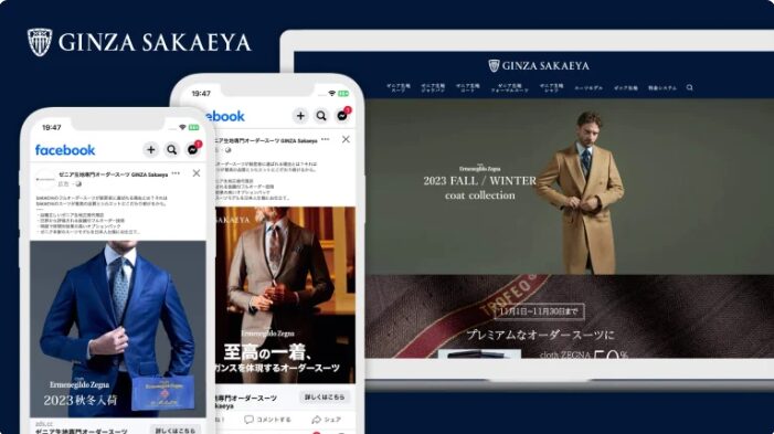 さらに、高級オーダースーツの魅力を視覚的に訴求できるFacebook・Instagram広告も活用し、新規顧客層への認知拡大を図りました。その結果、広告費を約80%削減しながら、コンバージョン数は4倍以上に増加する成果を達成しました。