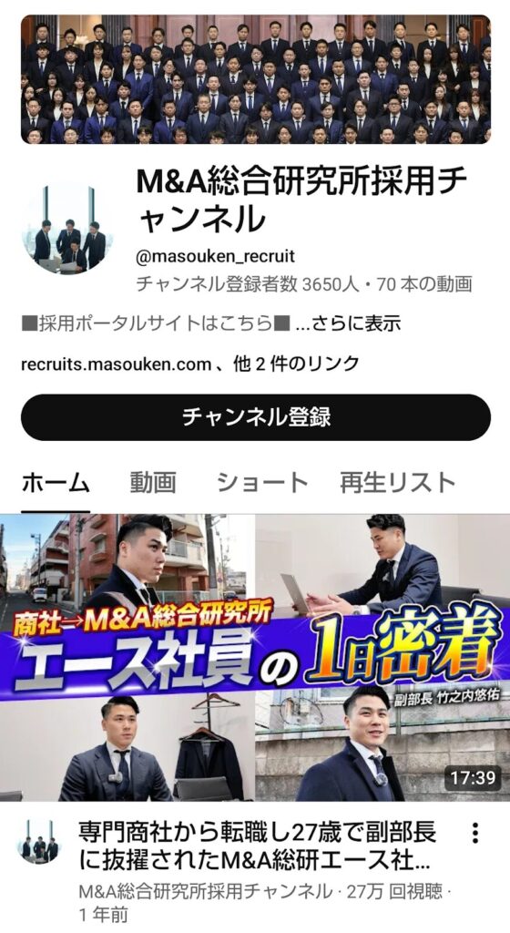 YouTube採用の成功事例7社の7つ目は、「M&A総合研究所採用チャンネル」です。