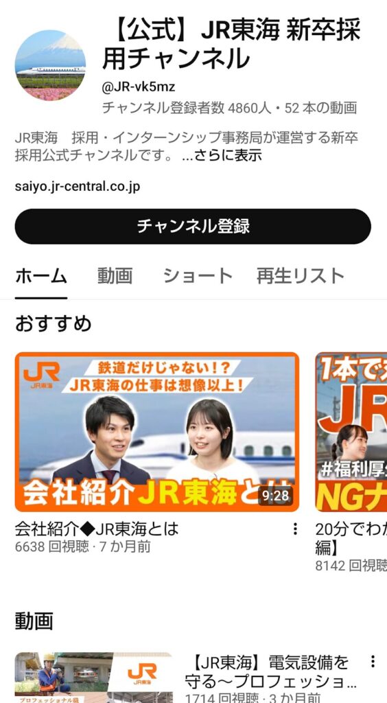 YouTube採用の成功事例7社の6つ目は、【公式】JR東海 新卒採用チャンネルです。