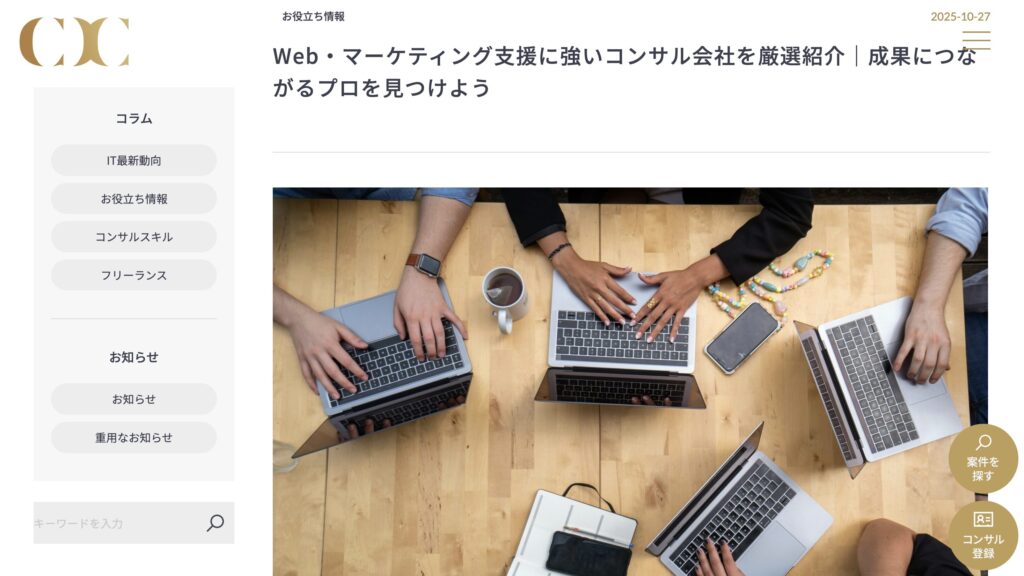 ネクストワークコンサルティング株式会社の運営するメディア「コンサル案件.com」内の記事「Web・マーケティング支援に強いコンサル会社を厳選紹介|成果につながるプロを見つけよう」に当社が掲載されました。